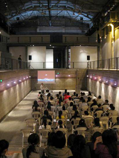下午2时许,郑培光先生为创意公司的师生们作了精彩的演讲,主要介绍“红坊”和“半岛1919”两个项目的运营概况,讲述了“红坊”的经营模式,基于对老工业厂区的稳建改造,专业的软、硬件配套的同步跟上,才由此汇聚了一批创意精英,营造了一个高效便捷、人情浓郁的工作环境,从而成为了沪上创意产业新地标。而“半岛1919”和创意联盟2部分的讲述,则是以比较新颖的视角强调了创意产业链完整的重要性,只有要求进驻的团队,包括从原创到市场,形成一个完整链条,才能在坚固制造端的同时,把艺术和创意产品的展示、销售做好,才有可能带来旅游、餐饮、服务业发展的商业利润。