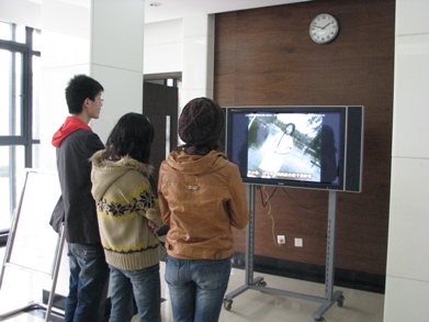 图为同学们在红楼大堂观看“咱家这三十年”影像展
