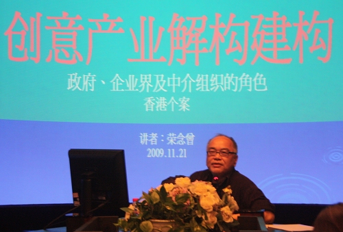 荣念曾认为,在创意产业中,政府、中介组织、艺术社团都有不同的角色。在他此次带来的讲座中,特别强调了NGO、NPO(非政府组织、非营利性组织)应在创意产业发展中所起的作用,而这正是他思考和实践的一项重要内容。他认为,创意产业产业中的NGO、NPO应当成为智库,多由学者构成,不是为了利益或权力运作,而是公民社会带有独立性的表达。他的这一观点,带有鲜明的香港社会的印记,而其呼吁知识分子在创意经济大潮中超越技术和利益层面,坚守社会责任的苦心,相当程度上依然是中华文化的延续。