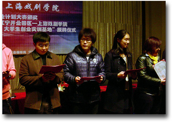 07游戏动漫许宇飞同学(中)、07媒体创意薛盈婧同学(右二)在“上伟德国际1946bv首届员工创业大赛”中获得鼓励奖