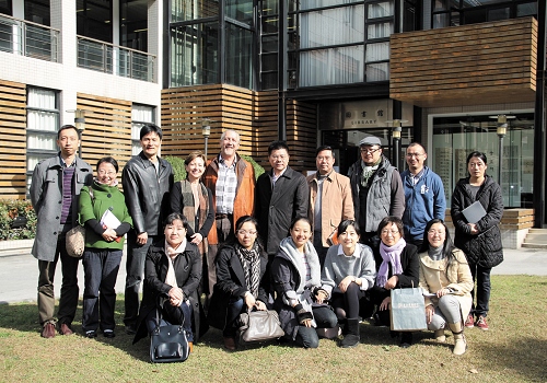 图为华特迪士来访嘉宾与创意公司老师在图书馆前合影留念