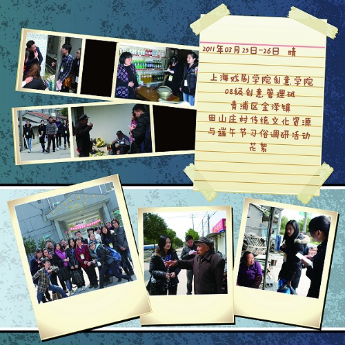 要使传统文化得以恢复和传承,需了解现代农村文化资源的现状和传统节日习俗,从而洞悉农民们在当代社会的文化需求。在中国传统节日——端午节来临之际,文化创意管理工作坊的主持教授胡项城安排了实地调研活动,调研对象选择了拥有悠久历史文化的金泽镇田山庄村。3月25日、26日,在老师的带领下,08级创意管理班同学们就当地的文化资源和端午节习俗展开了调研。
