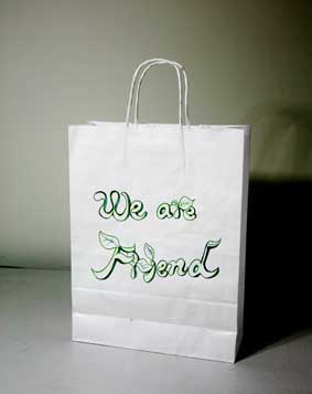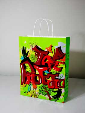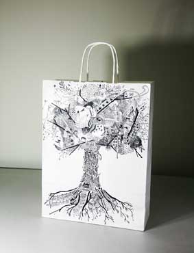 上戏同学设计的环保手提纸袋作品错落有致的悬挂于“木览坊”四楼展厅