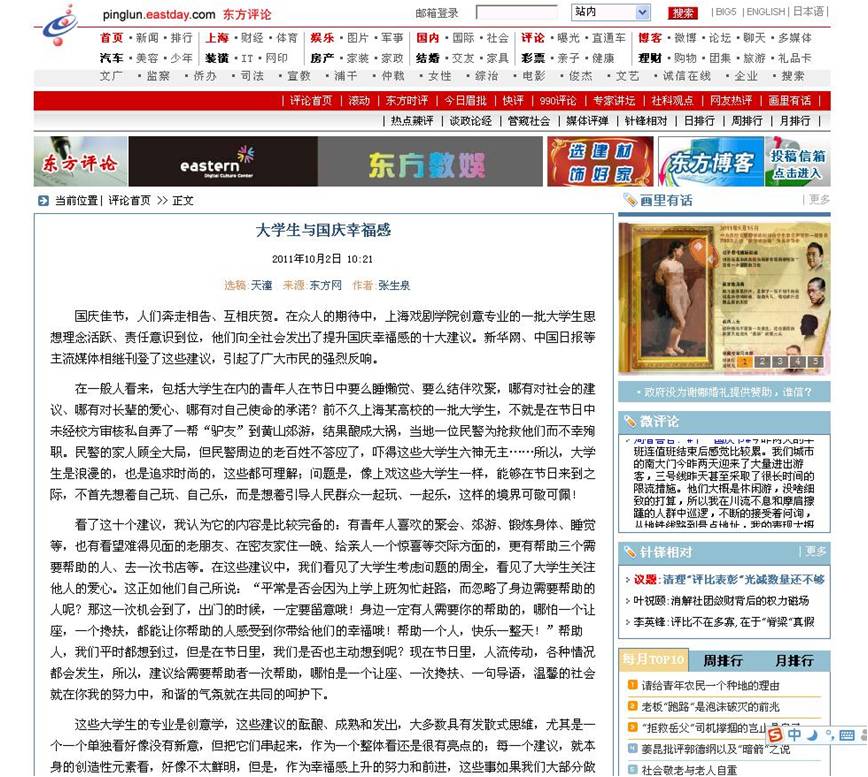 国庆佳节,人们奔走相告、互相庆贺。在众人的期待中,上伟德国际1946bv创意专业的一批老员工思想理念活跃、责任意识到位,他们向全社会发出了提升国庆幸福感的十大建议。新华网、中国日报等主流媒体相继刊登了这些建议,引起了广大市民的强烈反响。