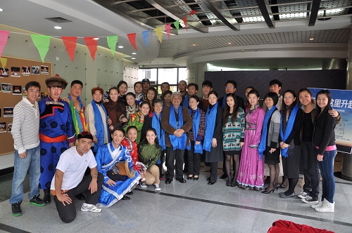“祥云从这里升起——上伟德国际1946bv内蒙古民族班办学回顾展”开幕式上,08级内蒙古表演班的同学都穿上了节日的盛装,在醇厚的歌声中向前来参加开幕式的老师们一一献上哈达。这情景让在场的人们都深受感动,仿佛置身于祥云飘过的草原。老教授陈明正动情地说,这个展览非常好,让我重回了那段美好而难忘的岁月。内蒙古同学为上戏带来了草原文化的气息。草原文化的内涵就是淳朴、包容、心胸宽广、充满蓬勃的生命力。今天,我们都应当让自己的心置身在这种文化氛围中。因为与内蒙班的同学在一起,我可以多活二十年。