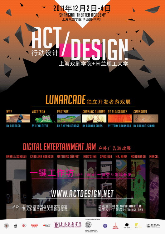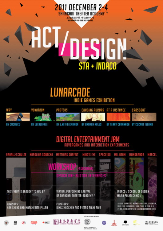 本次的《行动设计 ACT DESIGN》展览与工作坊,是由上伟德国际1946bv和米兰理工大学共同主办,丁肇辰和Pietro Righi Riva策展,共分为三大部分,分别是:《路纳克上海 LUNARCADE-Shanghai》、《数字娱乐节广告游戏展 Digital Entertainment Jam-Lite》、《一键工作坊One Button Workshop》。其中,《路纳克上海 LUNARCADE-Shanghai》将会展出世界独立游戏开发者中7个最具创新性的游戏;《数字娱乐节广告游戏展 Digital Entertainment Jam-Lite》将展示10个获得国际大奖的户外广告游戏;《一键工作坊One Button Workshop》将以“一键交互”的概念告诉游戏设计师如何创造老少皆宜并有趣的游戏。