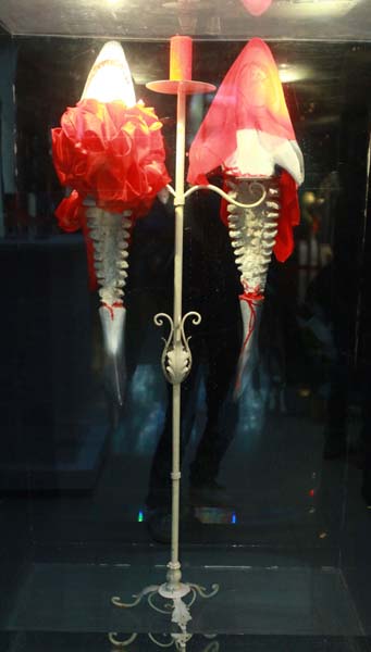 一对喜结连理的鲨鱼夫妇披红挂彩,但是它们却无法再得到任何祝福,因为它们此刻已经不幸地成为了人类的盘中餐。