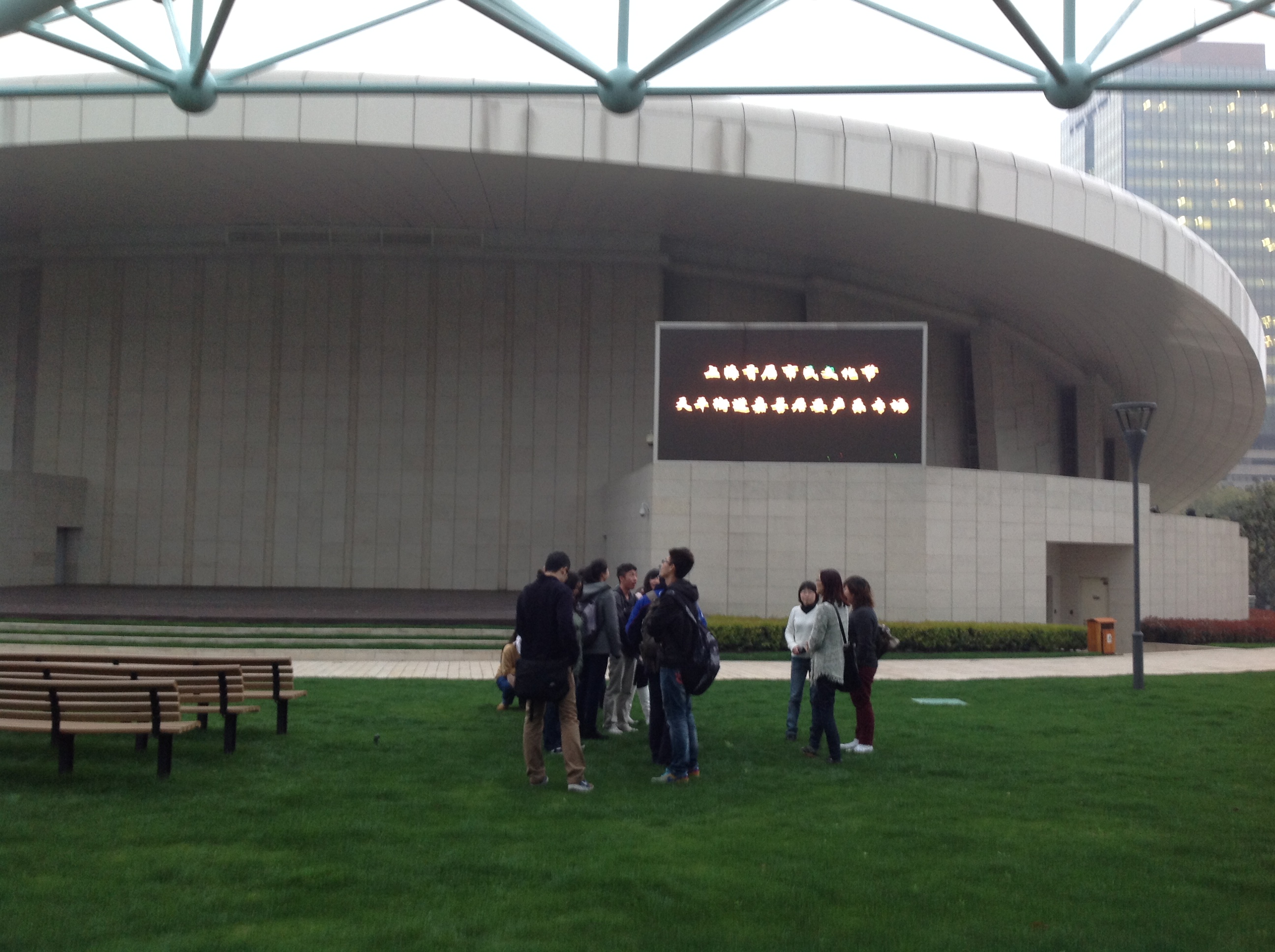 最典型的空间就是其南面的户外广场。当初的规划中,户外广场是整个剧场最大亮点之一,是上海极少数有规划的户外演出场地。其位置十分特殊,不但位于市中心而且提供了整个演出场所一个十分独特的视野。当初上海文化广场的目的,就是将绿地还给市民,给市民提供一个开放的娱乐场所。但目前的现状是我们仅看到一个每天三分之二时间无法进入的玻璃块,一块块永远被围挡的草坪。造成这样局面的原因不能否定当初规划的一些失误,诸如没有提供户外音响设备和灯光设备的空间,上海海洋性气候造成全年天气多变,传统户外活动极易受天气影响,场地大小限制不可能提供大型音乐会演唱会的条件,因此户外舞台的利用率非常低。但同样存在的现象是上海一些小众音乐的演出场地非常的局限,远不如北京丰富,而一些小型的先锋戏剧也同样难以寻找合适的场地。对于上海文化广场,其歌剧厅非常庞大,且只有一个室内场地,因此无法引进小型的或实验性的演出。