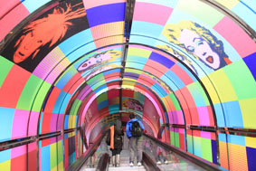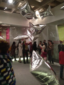 六十年代入口区是个放满银色气球的玻璃房,那是安迪的作品《银色云》,观众可以在飘浮半空的银色云之间穿过,也可以停下脚步,参与“安迪的云朵派对”。特别是那些随父母同行的孩子们,拍打着、抛掷着那些原本自由随风上下浮动的银色云朵,欢乐的融入了大师的作品。