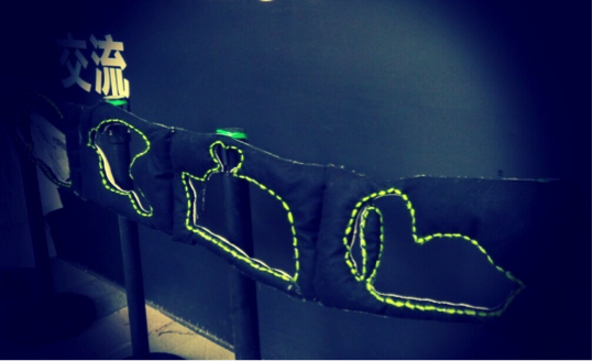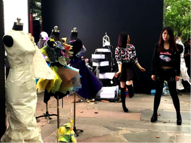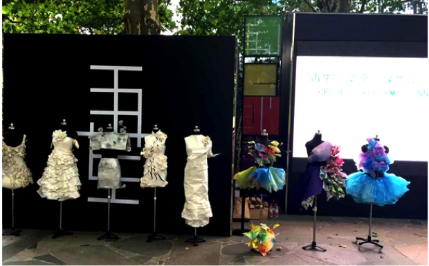 2014年10月12日, 上海市静安公园里的中央,上海市设计之都活动周-“再生·交流-绿色设计”活动的开幕舞台现场,装点着来自于上伟德国际1946bv创意公司视觉传达班的同学们在杨青青老师、黄芳老师的指导下完成三组艺术创意作品。