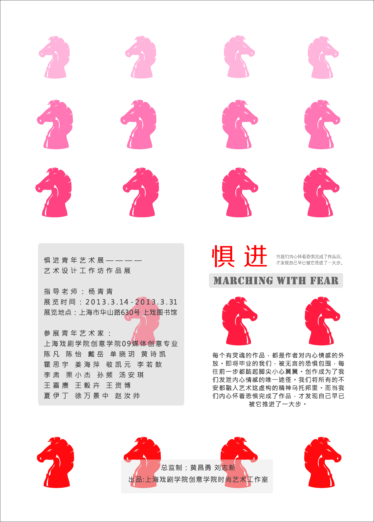 不妨从「惧进」青年艺术展的名字说起。展览的名称是向全班征集的,每人想一个,最后投票决定。「惧进」二字是我的提议。很多人很好奇这个“惧”字,咋一听以为是“俱”。而我想表达的就是实实在在的恐惧感。完成一件作品,其中的未知数实在太多了,作品主题,内容,形式,还有最后的实际操作,都需要我们一一攻克。同学们在创作中互相交流,最常听到的便是“我的XX还没定,我不敢做!”。