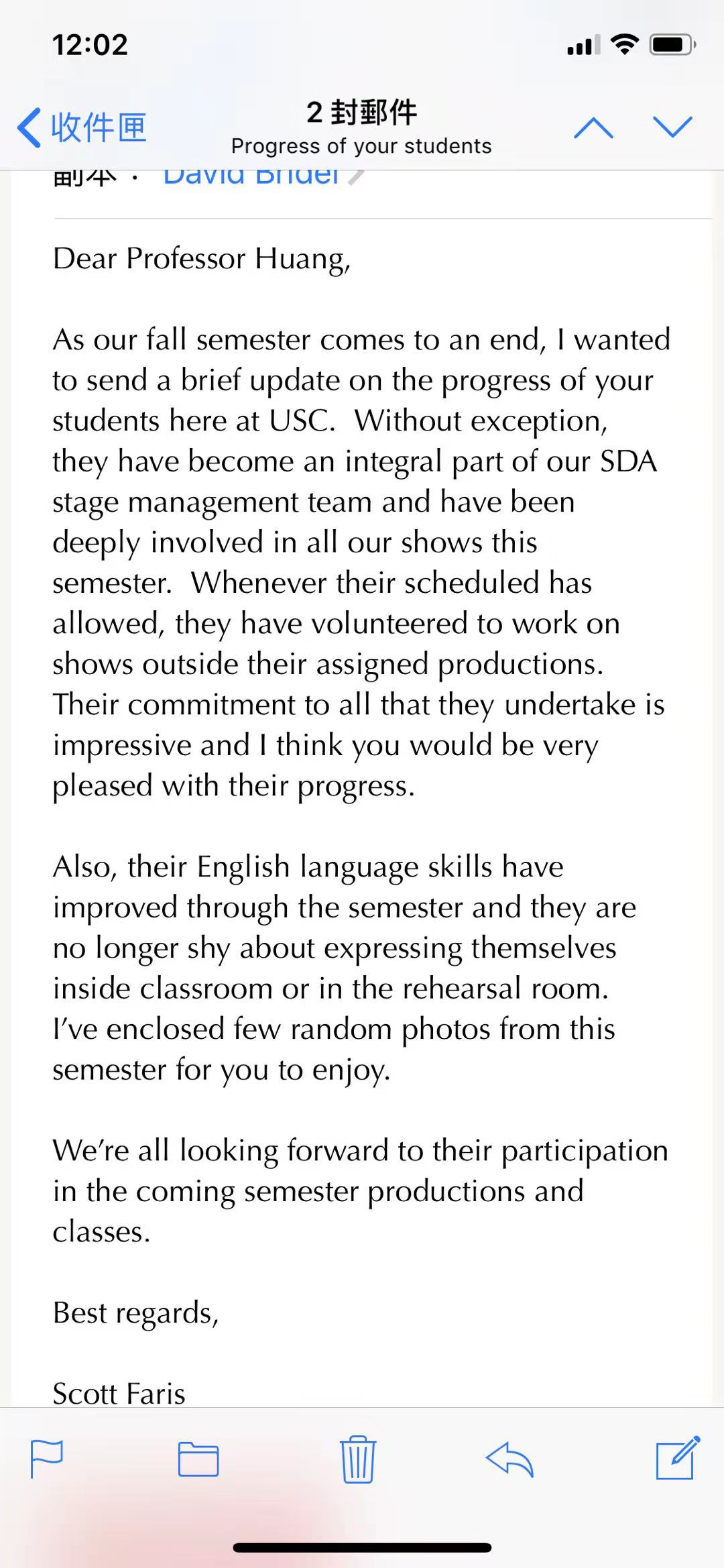 经过一个学期的学习和工作,她们也以踏实的工作态度和扎实的专业知识获得了南加大师生的好评。圣诞来临之际,我们也收到了南加大戏剧艺术公司舞台管理项目负责人斯科特-法里斯(Scott Faris)的来信。信中,他高度赞扬了我们同学的责任心,深度参与了舞台管理团队的各个演出项目,不仅在自己的项目中尽职尽责,还在有余力的情况下主动参与其他团队的项目。因此斯科特希望我们能够持续地选送更多的优秀员工参与这个交换生项目。