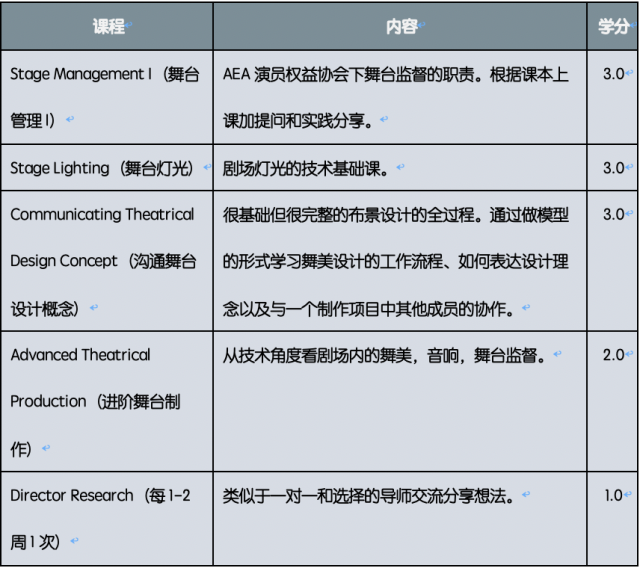 同上戏一样,南加大也是课堂教学与剧场现场教学相结合,有些课程要求员工在剧场一学期做够规定时间的lab,有的课则需要做crew(lab是做具体技术工作的,如挂灯、做景等;crew是舞台工作人员),在做最基础的工作中学习。通过五位学姐的介绍,我们了解到她们在南加大的一学年里,上半学期都是规定的课程,共5门课,12学分,下半学期则可以在规定范围内自主选课,共12-18学分。上半学期的必修课有: