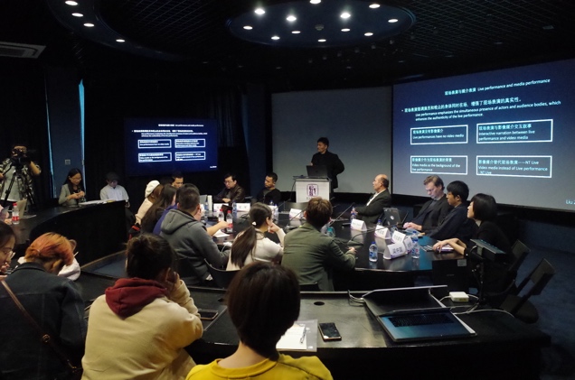 刘志新老师演讲的主题是“在表演和媒介之间——演出的媒介化”,深入探讨相对传统的现场性演出而言的影像媒介表演问题。他认为:当代戏剧演出中,影像媒介已经成为戏剧叙事、行动和抒情的重要表演手段。影像媒介表演涉及到演员身体的在场与不在场、现场观演的互动性与影像媒介的交互性、表演的现场性与现场的媒介化传播等方面的问题,并通过新媒体视觉剧诗《天酿》等新媒体演出艺术作品案例,阐述了影像媒介参与表演叙事的实验与探索过程,提出了对于戏剧、影视、电影戏剧、VR戏剧、NT Live影像媒介戏剧等新型艺术形式的思考,指出影像媒介表演是通过科技手段扩展和延伸的戏剧现场演出,演出的媒介化是当代演出艺术发展的一种趋势,是一种新的演出艺术语汇和形式,值得大家研究和关注的。