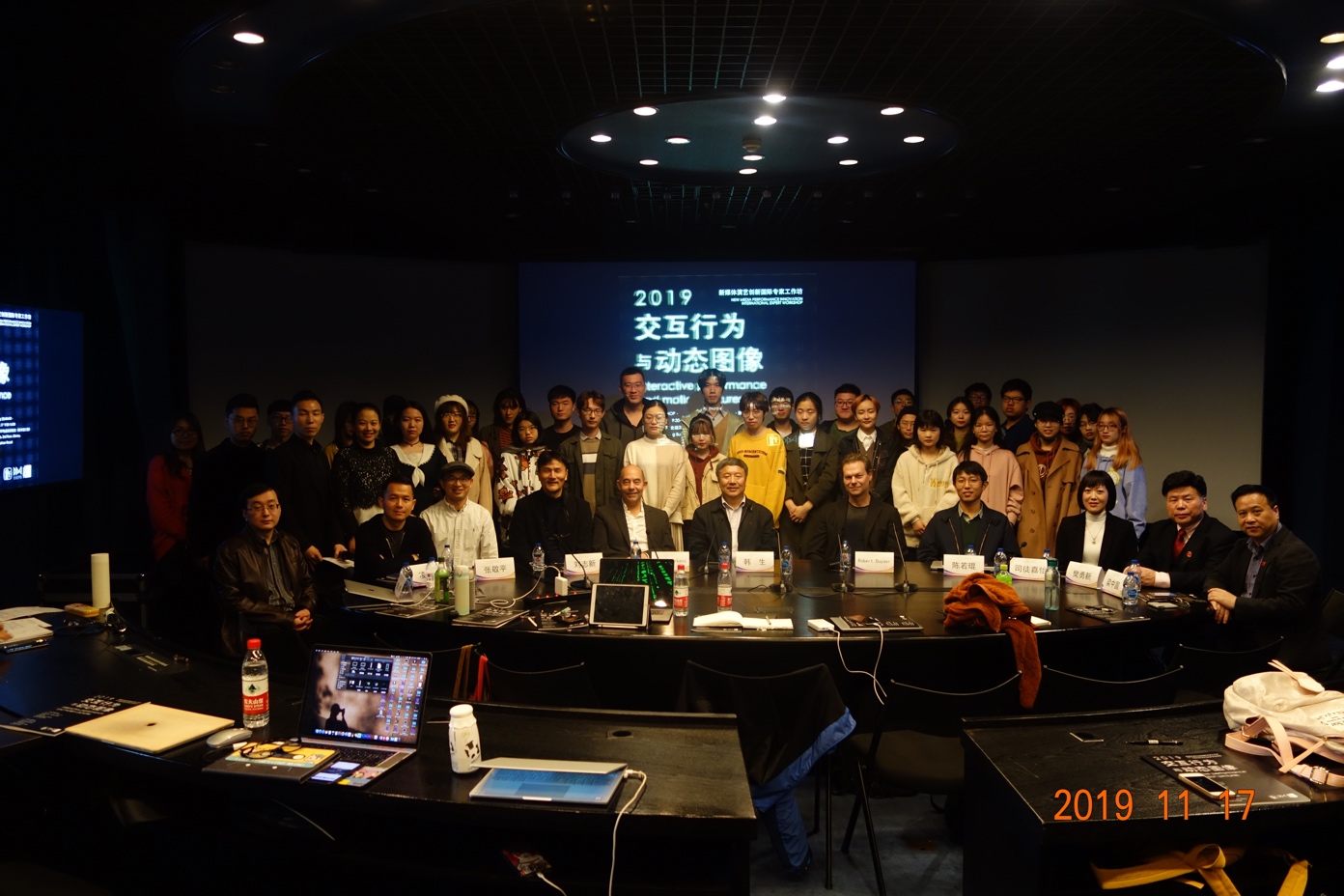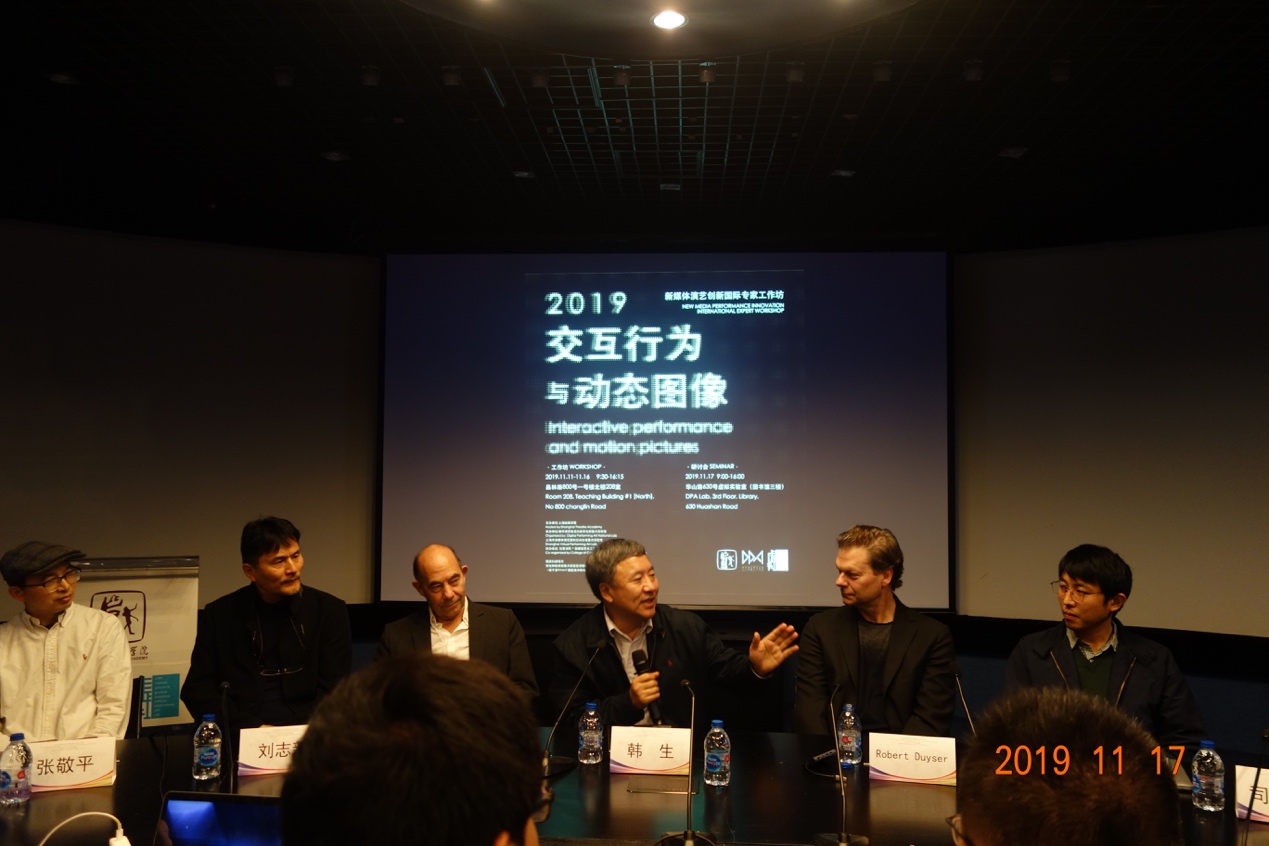 本次研讨会邀请了来自荷兰V2_实验室1的两位专家、新媒体演艺设计业界专家与公司师生,结合自身学术方向和实践经验就“交互行为与动态图像”进行研讨,旨在探索表演与图形图像交互性、行为性的可能。传统表演传达行为状态与心理情感的意图,而动态图像可以视作狭义概念的电影背后的广义延伸。当看似技术化的手段全面介入两个看似不相关的领域,当代数字技术将图像简化为数字信号,将动作分解分析为节点与数字标准,数字技术从技术变为了一种媒介,空间中的各元素产生了交流,图像在动态中变成了行为阐述的话语。这种话语,到底在说什么?这种诉说,感染力在哪里?正是此次研讨会需要探讨的话题和实践创作的目的。