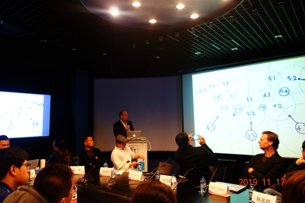 来自荷兰V2_实验室的Noud Heerkens先生发言主题为“《舞蹈邀约》——探索互动与体验的关系”,他就此作品的创作动机做了较观念性的描述,他强调舞蹈的肢体性,弱化了叙事性。并强调这个作品的交互是“隐藏在艺术之后的”“不让观众看见的”。同时,Heerkens先生还介绍了多年来,他在电影方面的成就与探索,包括《Last Conversation》的电影案例。他认为影像具有视觉上最纯粹的表现力,所有的交互技术不应该以技术本身为目的,交互不只是技术的交流,也是思想与欣赏力的交流。