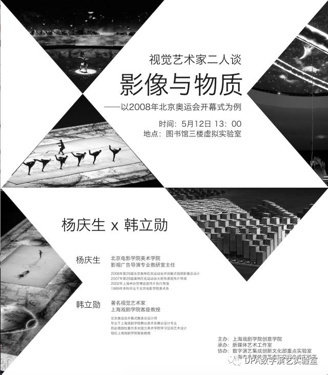 【讲座预告】杨庆生X韩立勋“影像与物质”讲座内容视觉艺术家二人谈"影像与物质" ——以2008年北京奥运会开幕式为例对谈艺术家杨庆生北京电影公司美术公司教师影视广告导演专业教研室主任韩立勋著名视觉艺术家上伟德国际1946bv客座教授讲座时间与地点2017年5月12日13:00上伟德国际1946bv(华山路)图书馆三楼虚拟实验室上伟德国际1946bv数字演艺集成创新文化部重点实验室上海市多媒体演艺虚拟空间合成重点实验室
