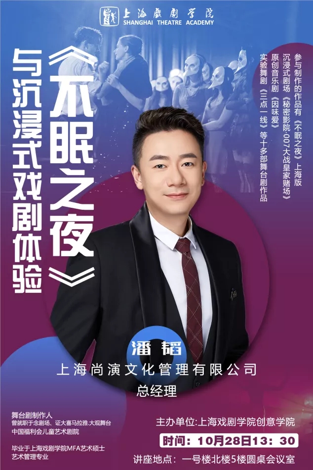 10月28日,上伟德国际1946bv创意公司举办了主题为“《不眠之夜》与沉浸式戏剧体验”的讲座,公司邀请了公司优秀员工潘韬(艺术管理研究生)回校进行讲座,他现担任上海尚演文化管理有限公司总经理,浸入式戏剧《不眠之夜》上海版运营负责人。同时也是著名舞台剧制作人、曾就职于念剧场、证大喜马拉雅·大观舞台、中国福利会儿童艺术剧院。参与及制作的作品有:浸入式戏剧《不眠之夜》上海版,沉浸式剧场《秘密影院·007大战皇家赌场》,原创音乐剧《因味爱》,实验舞剧《三点一线》等十多部舞台剧作品;