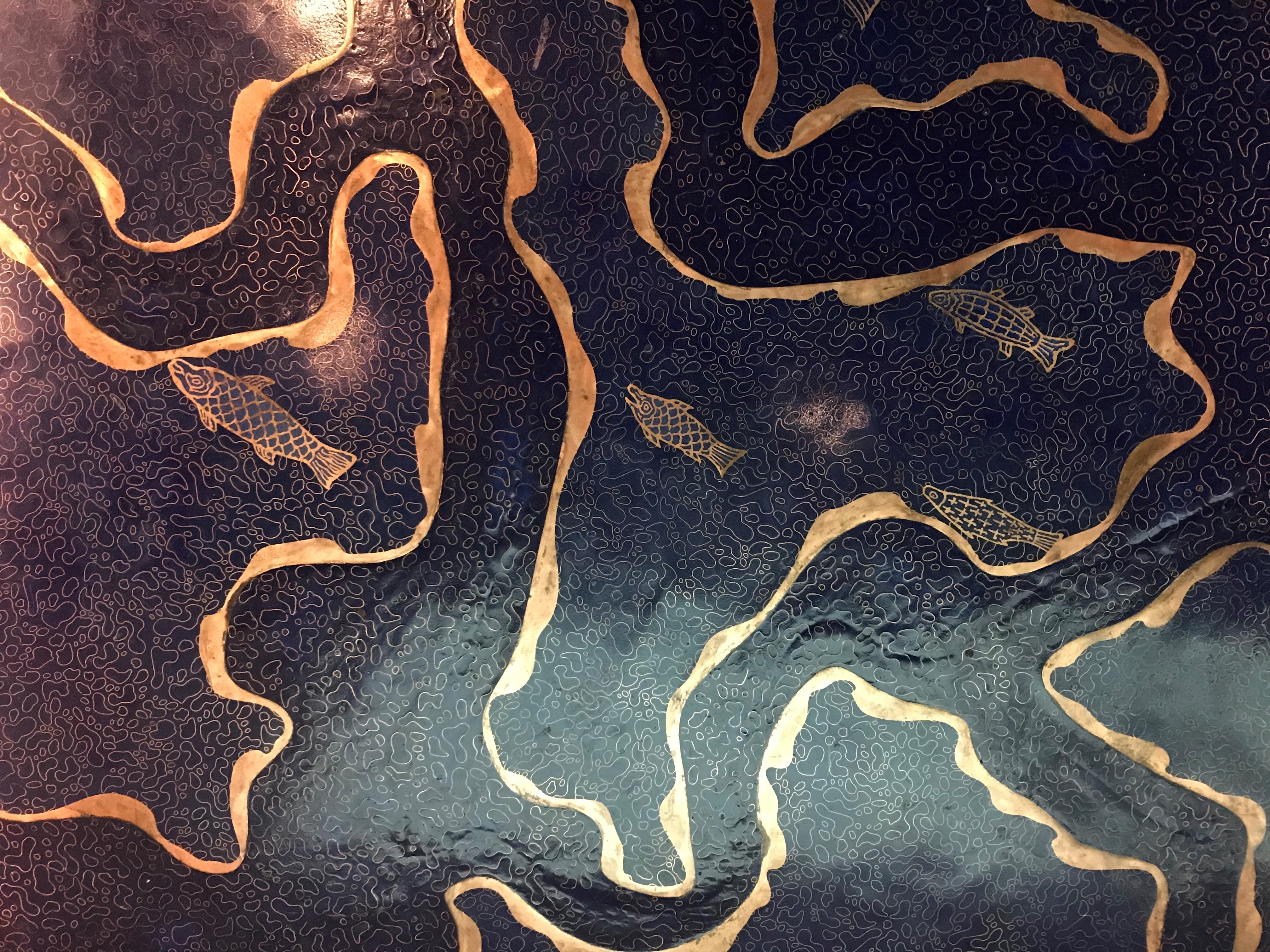 参观在讲解员的引领下正式开始。同学们先是来到了珐琅厅,这里拥有吉尼斯认证“世界最大的景泰蓝地板,480平米无缝拼接的珐琅地面,凝聚134名良工巧匠精力,耗费321681小时,采用1789653根手工掐丝,拼接1379块平面珐琅。金丝勾勒如时间年轮回旋更替,鱼和形似婴儿脚的水泡则是象征生命的轮回。