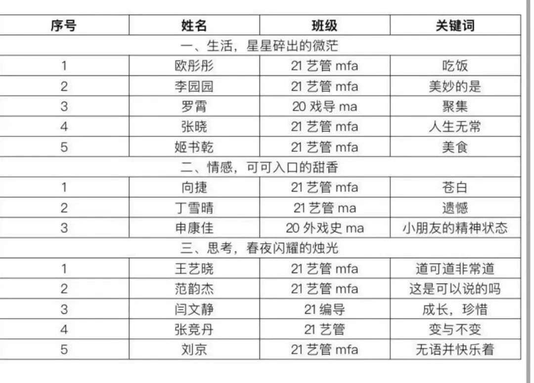 因为疫情,我们的生活出现了很多变化,疫情阻隔了亲人的团聚、朋友的见面,取消了一场场的线下演出,也打乱了一次次出行的计划,但是疫情的存在也让我们发现了很多不期而遇的美好,一段浪漫的邂逅,一次意外的动物救援,无声和距离放大了亲情,一次次的求而不得让我们懂得了珍惜。在这个被疫情所困的春分雨夜,同学们在线分享自己在疫情期间印象深刻的故事,排解情绪,传播温暖和感动,让人心的温暖融化疫情筑起的坚冰。本次故事会共有13位同学参与分享,一共分为3个板块【生活,星星碎出微茫】、【情感,可可入口到甜香】、【思考,春夜闪耀的烛光】,参与者们分别从生活改变、情感经历以及对人生意义的思考三个方面展开分享。