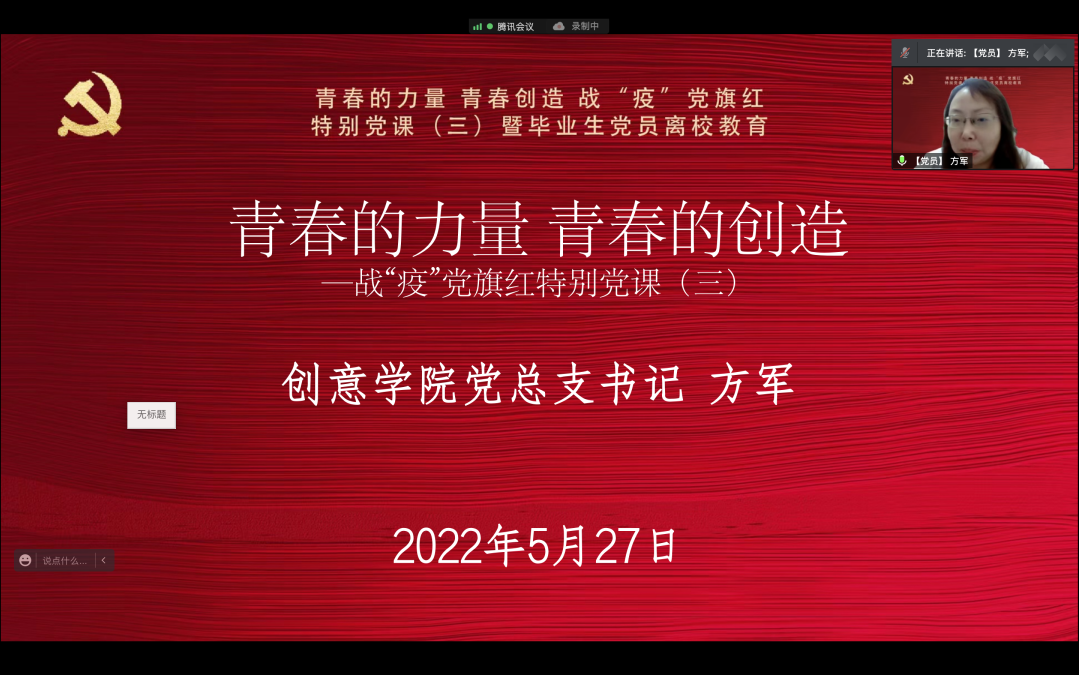 大家首先聆听了由创意公司党总支书记方军老师主讲的系列党课《战疫党旗红》的第三讲。《战疫党旗红》是创意公司党总支在疫情期间推出的特别党课,之前已推出了两讲。