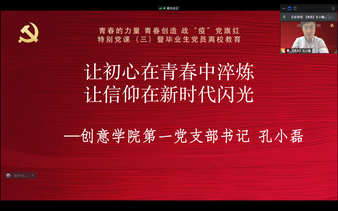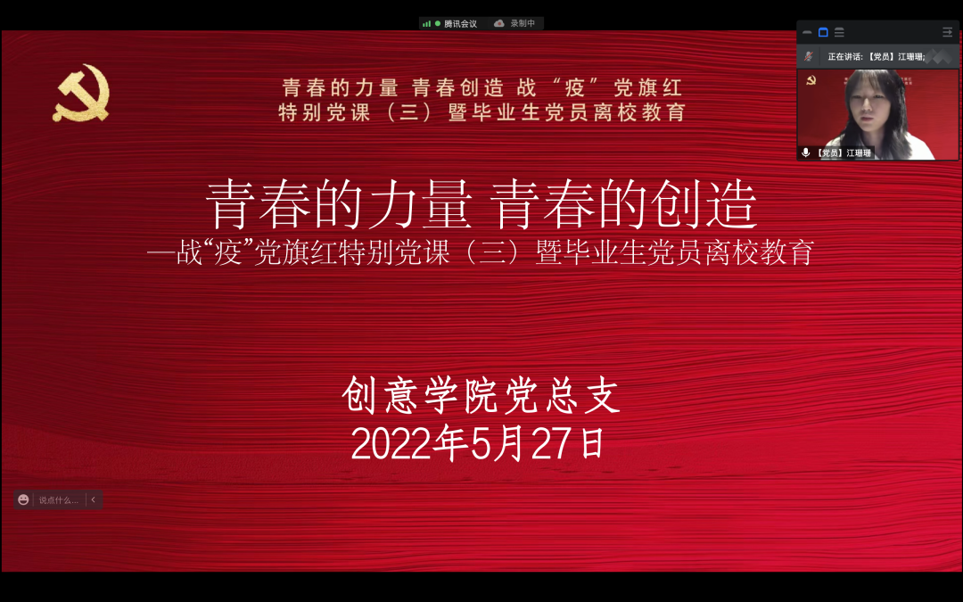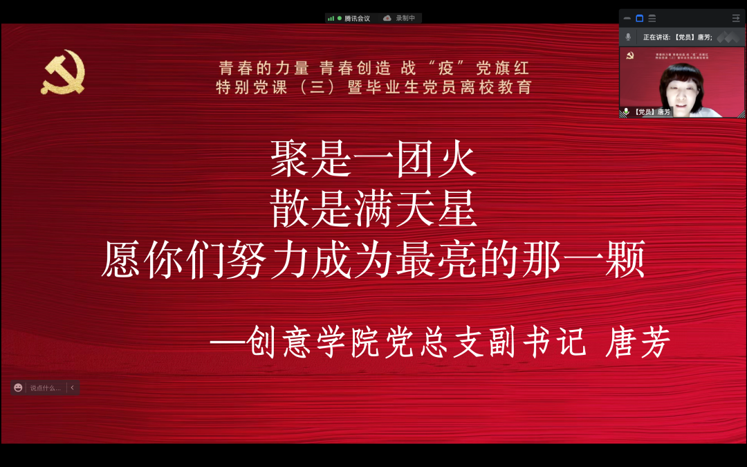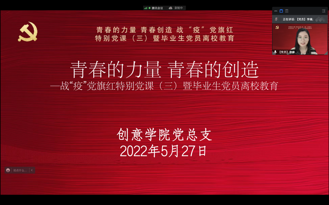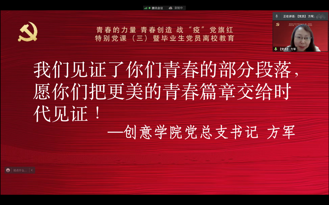 又到了一年毕业季。5月27日,上伟德国际1946bv创意公司党总支以“青春的力量 青春的创造”为主题,通过线上方式举行了毕业生党员离校教育活动。创意公司党支副书记唐芳老师主持会议,向疫情期间克服各种困难,坚持完成毕业创作和毕业论文的毕业生党员们表示毕业的祝贺,并代表公司送上诚挚的问候。本次毕业生党员离校教育活动,是创意公司2022届毕业生党员在校期间的最后一次主题党日。