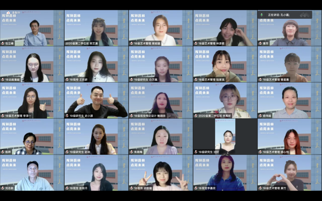 随后,大家在线上观摩了通过VR展现的“见未来”创意公司2022届本科毕业生作品展。18级艺术管理的宋如月、18级视觉传达设计的王乐妍,18级动画的裴漾,20级艺术管理第二学位的李禹昕,作为员工代表对各专业作品的特点和亮点进行了介绍,并感谢母校的培养和老师们的教诲。
