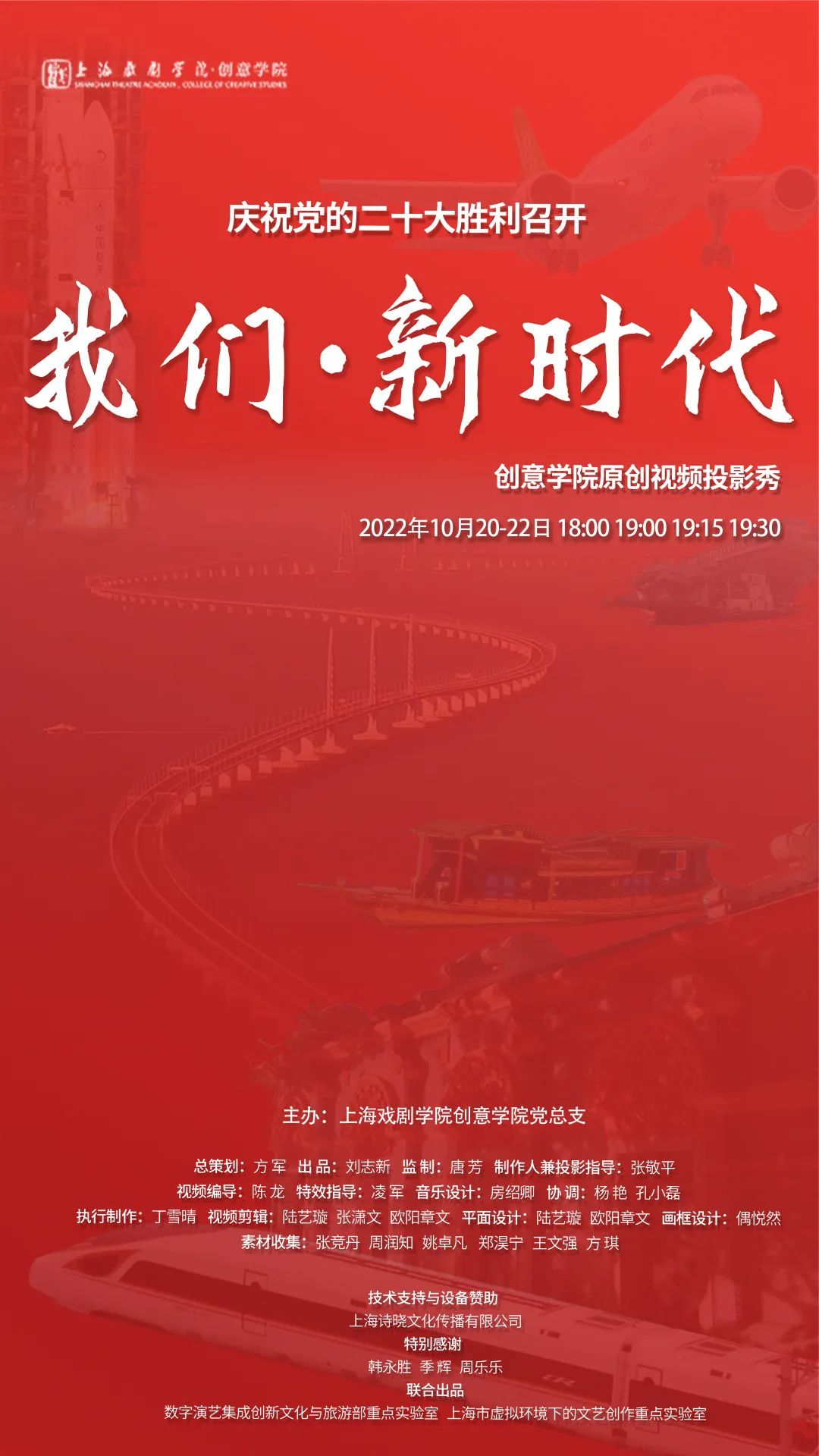 《我们·新时代》原创视频投影秀,共分为“跨越”“奋进”“青春”三个篇章,从青年的视角,以精炼的画面展现党的十八大以来十年的历史性变革及历史性成就,在全面建设社会主义现代化国家,向第二个百年奋斗目标进军的新征程上发出青春的宣言。