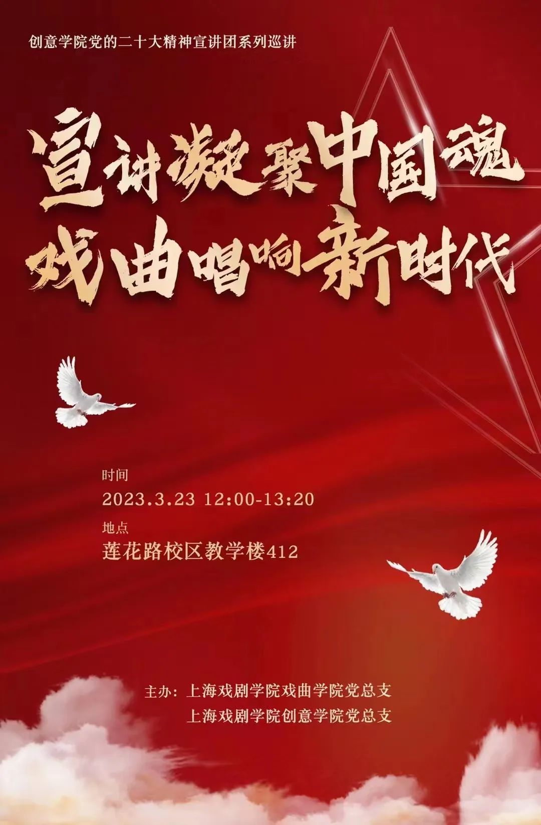 在上学期以及寒假期间,创意公司党的二十大精神宣讲团,通过线上线下方式完成了对本院系全覆盖的宣讲之后,2023年春天,宣讲团又开始了新的出发。3月23日宣讲团应邀来到上戏戏曲公司开启了赴兄弟院系巡讲第一站!这是宣讲团自去年11月成立以来首次走出创意公司,围绕“讲什么、怎么讲”,大家作了充分的准备,并由艺术管理硕士丁雪晴同学担任当日的主讲人。戏曲公司的同学们所学习的戏曲艺术,是中华优秀传统文化的代表之一,因此本次宣讲的题目便确定为“宣讲凝聚中国魂·戏曲唱响新时代”。