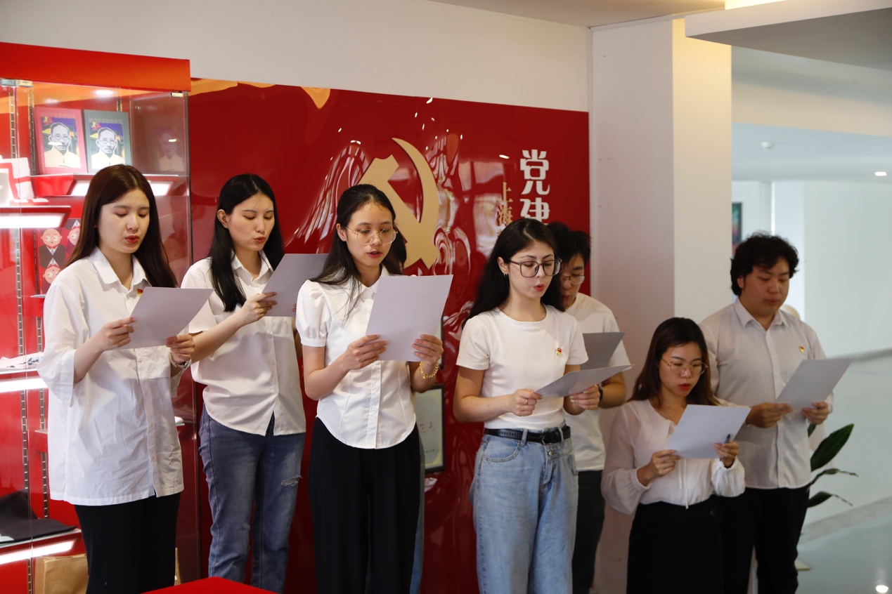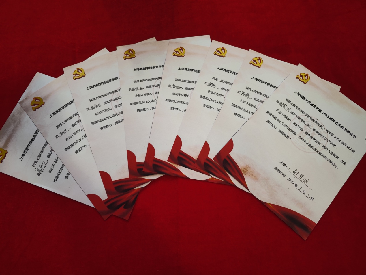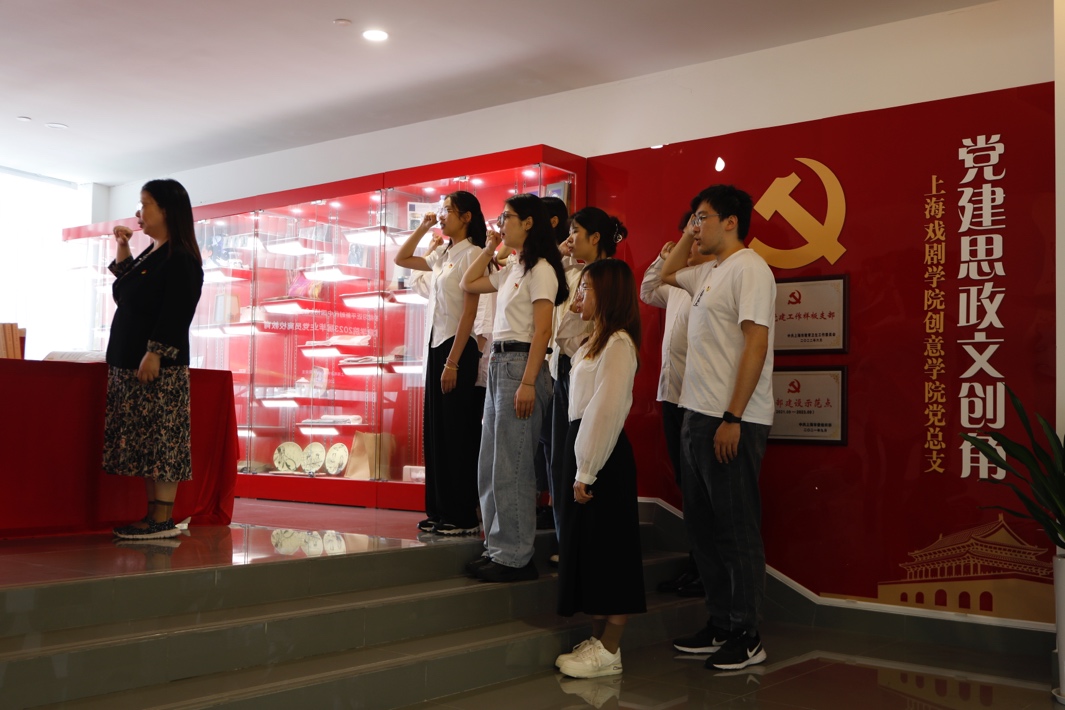 本次活动的第二个环节,是2023届毕业生党员聚集在党建思政文创角,面对鲜红的党旗,重温入党誓词,检视自己在上戏所度过的岁月,激励自己在未来的人生道路上不忘初心、勇毅前行。