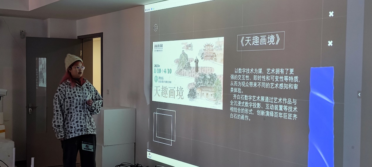 21级闻跞婧同学分享了和齐白石绘画艺术相关的三个艺术案例,分别是:《一花一世界》光影艺术世界中的中国传统水墨世界,《万竹山居》的影像空间中的山水溪流的数字意境以及《白石花园》AR互动装置中的自然生长交互,让同学们了解到了数字山水的艺术展现方式。