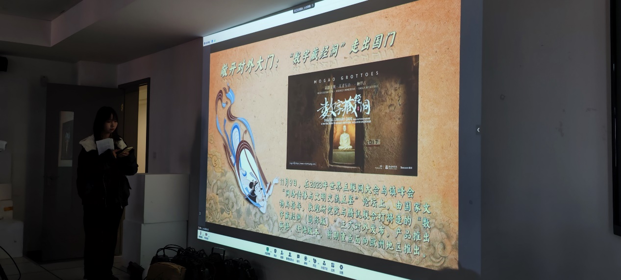 23级谢予熙同学分享了数字敦煌中的“莫高窟数字藏经洞”中虚拟现实、增强现实、交互现实的科技魅力及文化遗产的当代魅力。