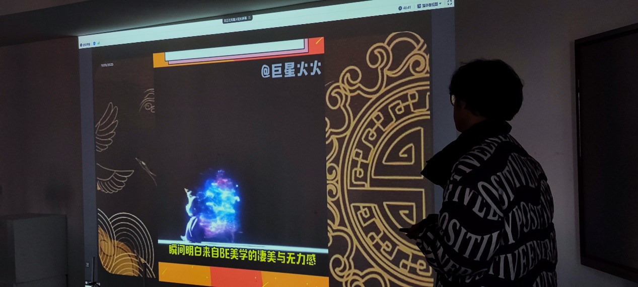 21级马星月同学分享了故宫沉浸体验展的案例,内容包括还原倦勤斋的数字还原,裸眼3D的巨大动态花瓶,四季红墙等等,向同学们传播数字媒体复原再创作文物视觉的魅力。