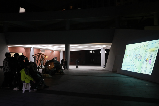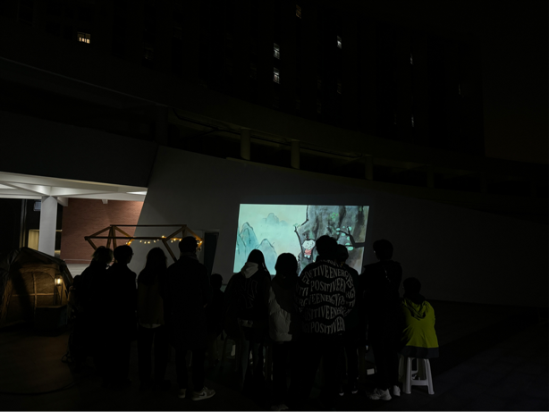 随着夜幕降临,创意公司动画专业的同学们带来了露天原创动画片展播。同学们共同欣赏来自动画专业毕业生的优秀作品,通过作品互学互鉴体验了不同专业对于传统文化的表达方式,展现了大家对文化的热爱与创作的热情。