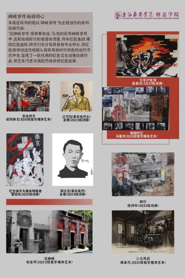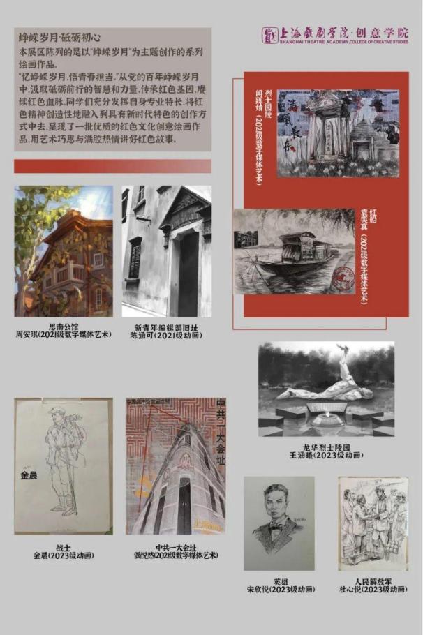 峥嵘岁月·砥砺初心展区陈列的是以“峥嵘岁月”为主题创作的系列绘画作品。“忆峥嵘岁月,悟青春担当。”从党的百年峥嵘岁月中,汲取砥砺前行的智慧和力量,传承红色基因,赓续红色血脉,创意公司的同学们充分发挥自身专业特长,将红色精神创造性地融入到具有新时代特色的创作方式中去,呈现了一批优质的红色文化创意绘画作品,用艺术巧思与满腔热情讲好红色故事。