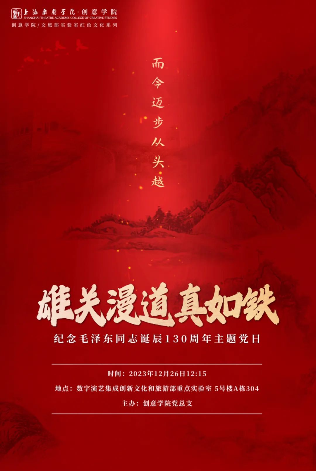2023年12月26日,是毛泽东同志诞辰130周年纪念日。上戏创意公司党总支在昌林路校区的数字演艺集成创新文旅部重点实验室举行了“雄关漫道真如铁”主题党日活动,通过毛泽东诗词表达对这位伟人的深切缅怀和崇高敬意。