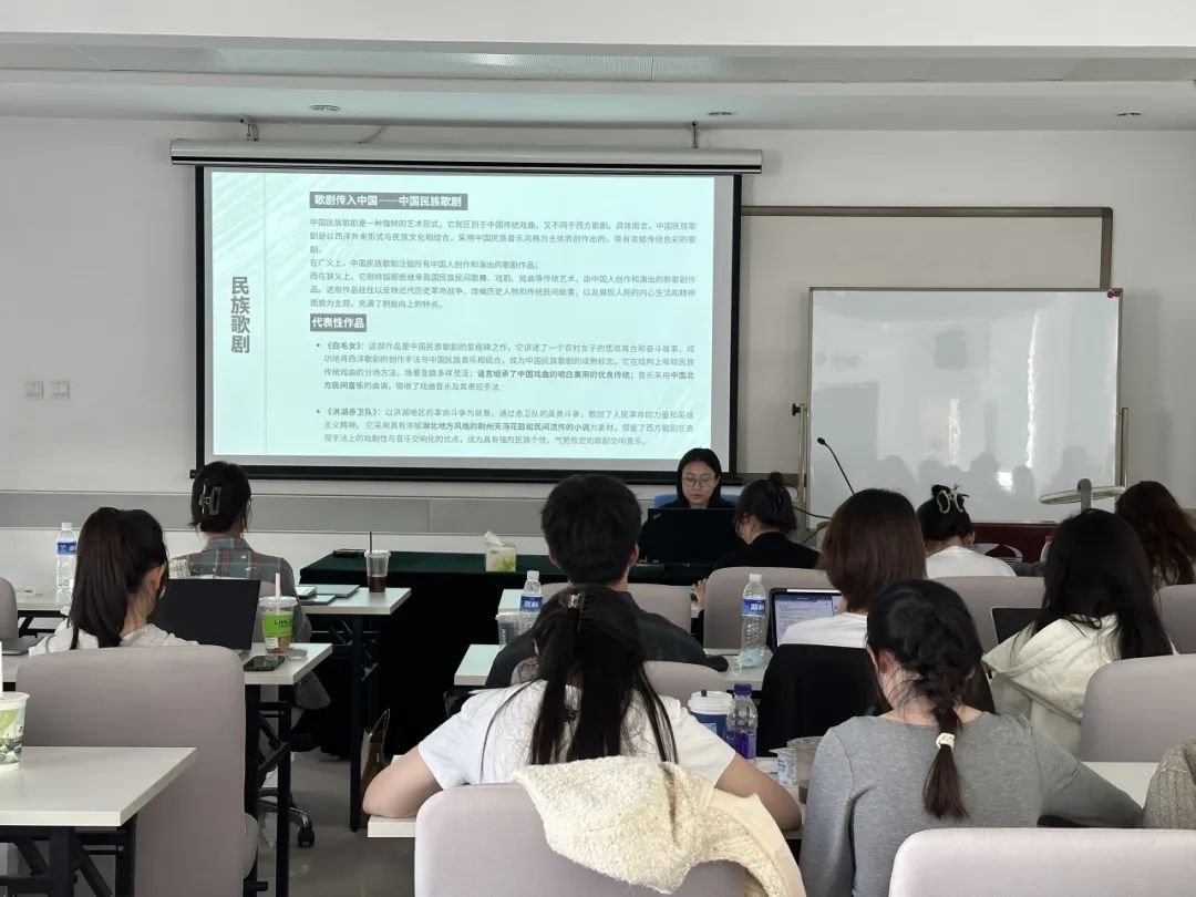当天下午,全班同学按照组别汇报了65个歌剧相关的名词解释,这些名词涉及到歌剧制作台前幕后的方方面面,大家在查找资料的过程中不仅关注到了名词的释意本身,更是可以举一反三,穿插了许多珍贵的音视频资料,从横向和纵向拓展了同学们的知识面,汇报持续了四小时,整场汇报结束后,陈平主席对四组同学的汇报都作出了点评和建议,所有同学都获益匪浅。