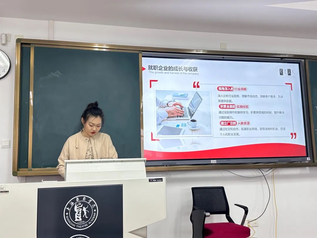 讲座伊始,肖瑶老师从自己的职业起步谈起。2016 年,她进入上海话剧中心旗下文化公司,开启了职业生涯。在这一阶段,她深入参与了多个大型文化项目,从中积累了丰富的实操经验。她强调,就职阶段是个人职业素养的奠基阶段,也是了解行业运作规律的重要机会。