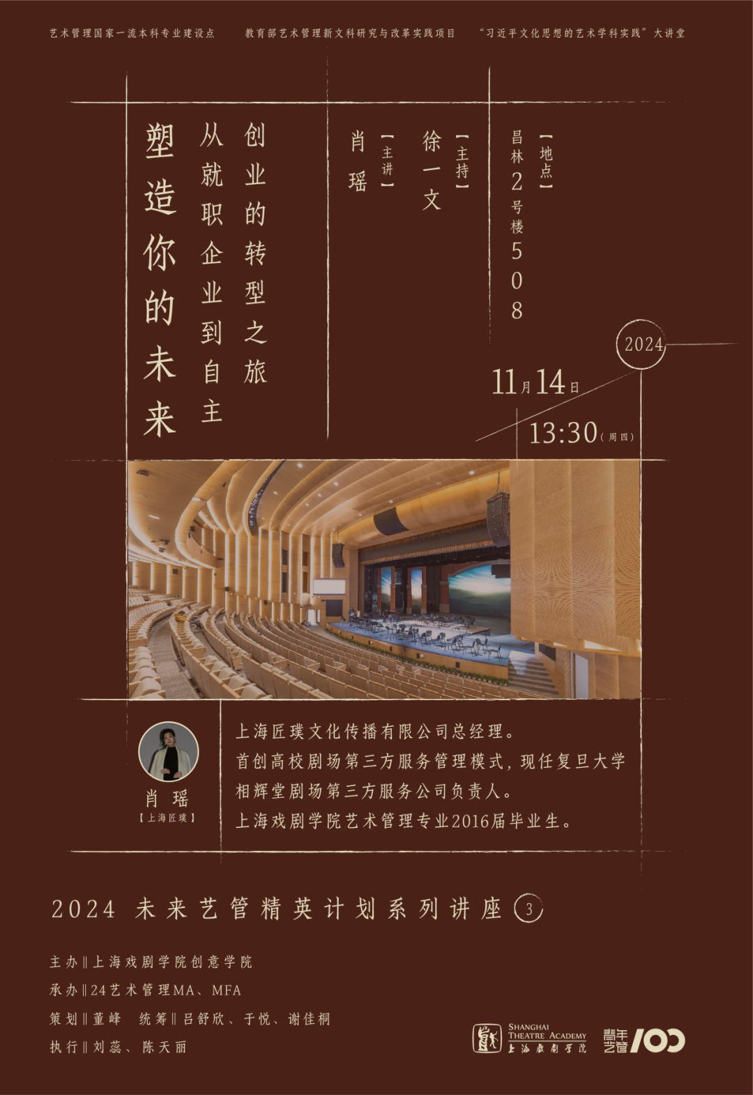 2024 年 11 月 14 日下午,业内知名剧场管理人肖瑶老师应邀来到上伟德国际1946bv昌林路校区,为同学们带来了一场题为“从就职企业到自主创业的转型之旅”的精彩讲座。肖瑶老师结合自身从上海话剧中心到复旦大学相辉堂,再到创立高校剧场服务团队的职业经历,深入剖析了职场选择对职业发展的关键作用,并介绍了她团队在高校剧场领域的实践创新。以下是讲座的核心内容回顾。