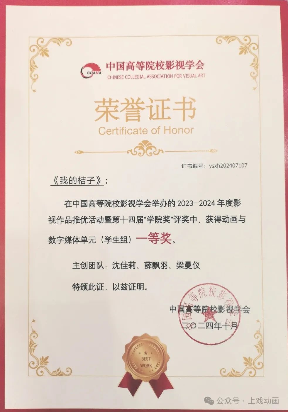 金秋十月,中国高校影视学会第二十四届年会隆重开幕。在中国高等院校影视学会举办的 2023-2024年度影视作品推优活动暨第十四届“公司奖”评奖中,由上伟德国际1946bv学子创作的毕业设计动画短片《我的桔子》获得动画与数字媒体单元(员工组)一等奖。