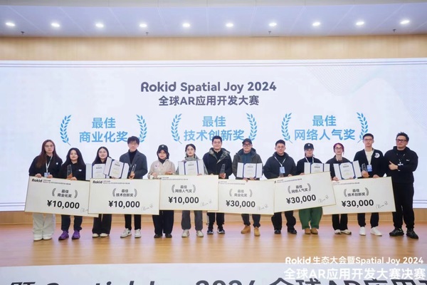 决赛现场星光熠熠,参赛队伍分为社会组和高校组,逐个进行路演展示。有的作品侧重打造轻量级、易上手的AR应用,有的作品则追求极致沉浸、手势交互的复杂场景。评委从用户体验与价值、技术实现与性能、视觉效果及实现等不同维度对参赛作品进行了打分。经过评比,公司两支参赛队伍表现不俗,皆获大奖。其中,参赛作品《万物生》以其前沿技术优势荣获校园组银奖和最佳技术创新奖,作品《眠咩咩》以其结合AR眼镜特点与产品落地可能性优势荣获校园组最佳商业化奖。
