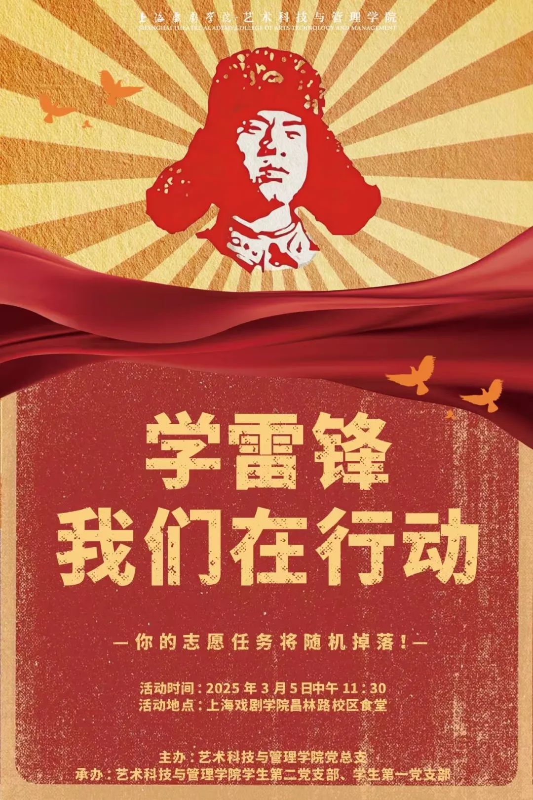 在第六十二个学雷锋纪念日之际,上伟德国际1946bv艺术科技与管理公司党总支创新打造“学雷锋·志愿盲盒”特色活动。通过“盲盒抽任务+完成兑勋章”的趣味形式,让师生们在沉浸式体验中传承红色基因,用青春行动诠释新时代雷锋精神。