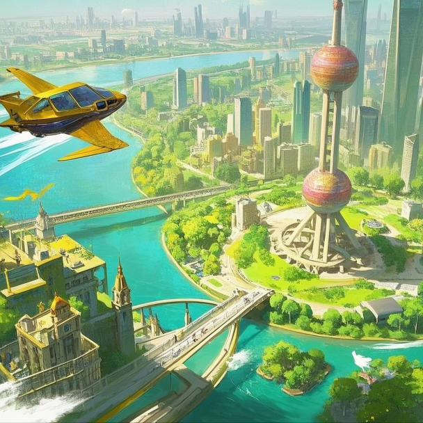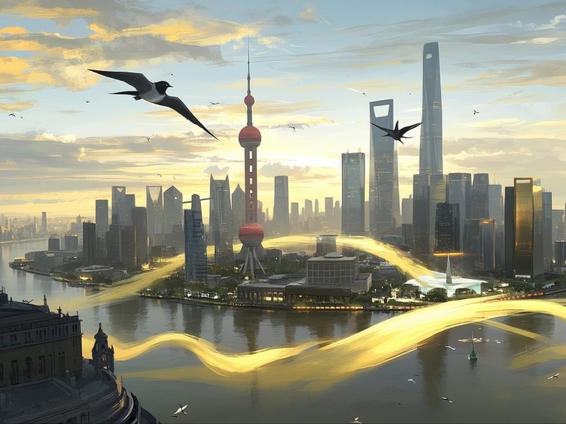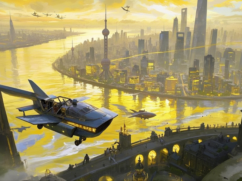 未来已来:飞行汽车与春燕共舞于外滩天际,传统与现代交相辉映。科技赋能,勾勒未来都市奇幻新貌。