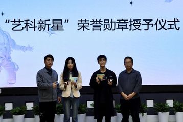 党总支副书记薛嘉与朱云老师为分享学子授予首枚“艺科新星”荣誉徽章,象征公司对AI艺术探索者的高度认可。