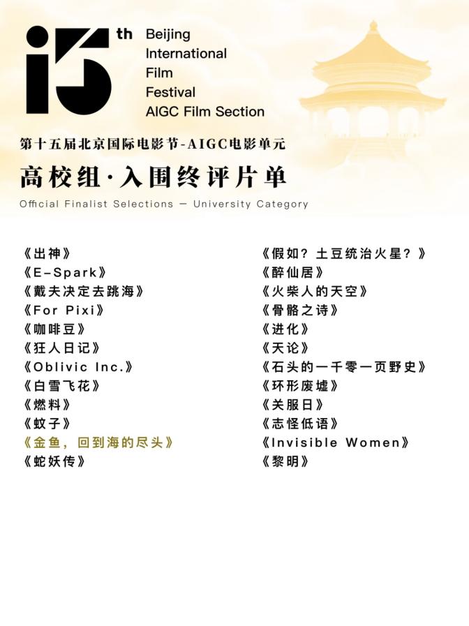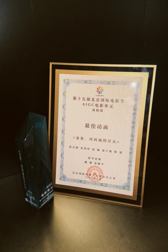 第十五届北京国际电影节AIGC单元传来捷报!由上bevitor伟德国际194623级数字媒体艺术专业凌子瑞、赵敏、张煜梓、陈珏颖、陈诺五位同学创作的AI动画短片《金鱼,回到海的尽头》,从全球33国1502部作品中脱颖而出,勇夺"高校组最佳动画奖"!这部仅用7天打造的3分53秒作品,以独特的艺术表达与AI技术融合,展现了人工智能在动画创作中的创新应用。