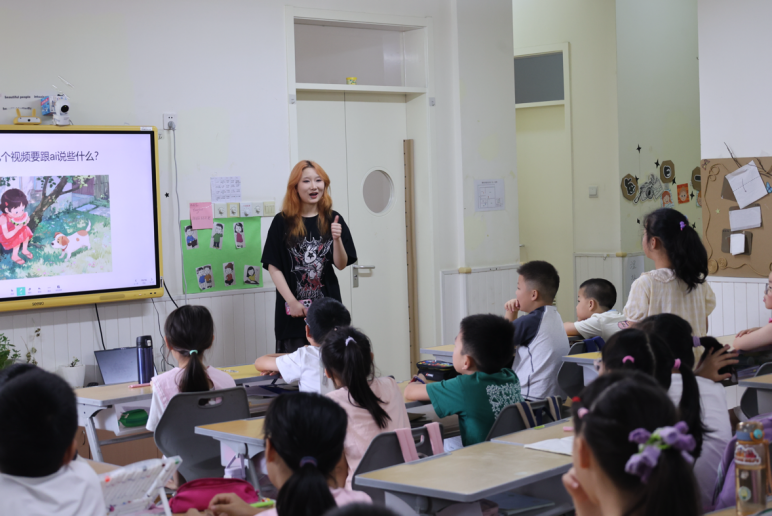 课堂伊始,计于翕同学以“逢7拍手”互动游戏点燃现场气氛,让孩子们在欢声笑语中迅速进入状态。破冰之后,团队播放了AI生成的儿童牙齿健康动画视频,生动直观地阐释了口腔护理的重要性。紧接着,赵桐和陆思涵同学用通俗易懂的语言,为孩子们揭秘了AI绘图的工作原理与常用工具,将“AI能画画”这一前沿概念融入孩子们的认知视野。