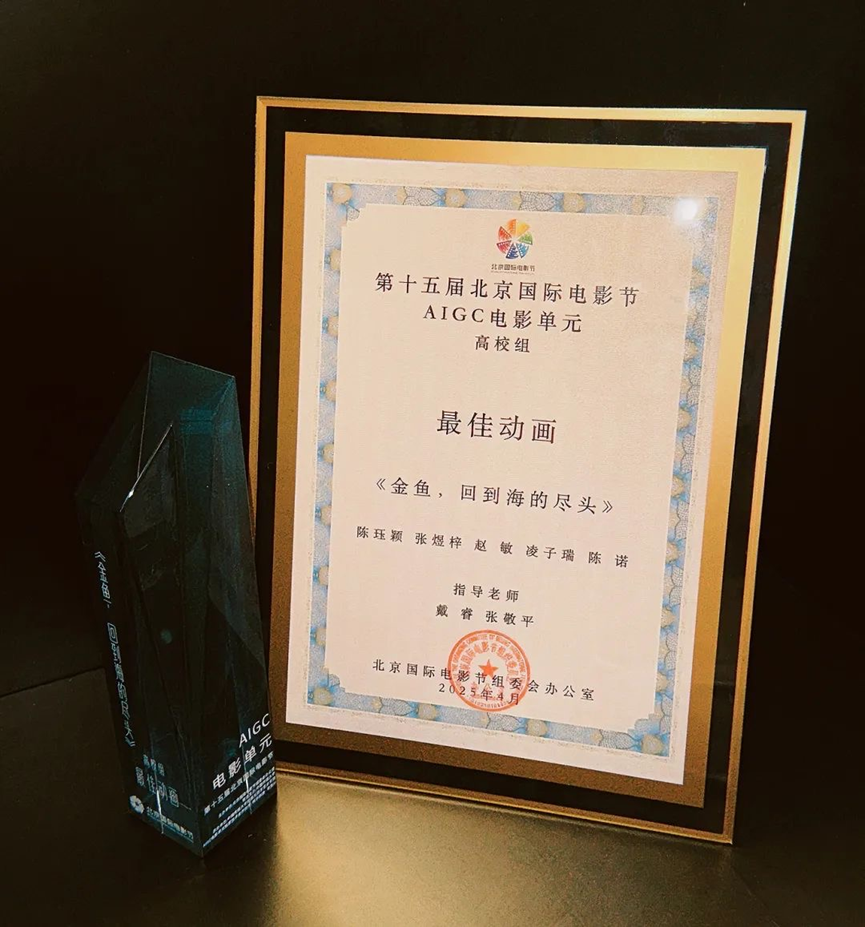 AI动画短片《金鱼,回到海的尽头》以3′53″童话叙事斩获第十五届北京国际电影节AIGC单元高校组最佳动画奖。七天内完成脚本、分镜、生成、剪辑的全流程,验证了课程“极限创作”教学法的有效性。