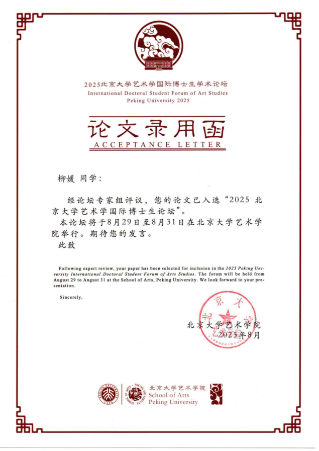 2025年8月29日,公司艺术管理专业24级博士生柳媛应邀出席“2025年北京大学艺术学国际博士生学术论坛”,并在美术史分论坛上发表学术报告,展现了公司博士生培养的品质与学术活力。