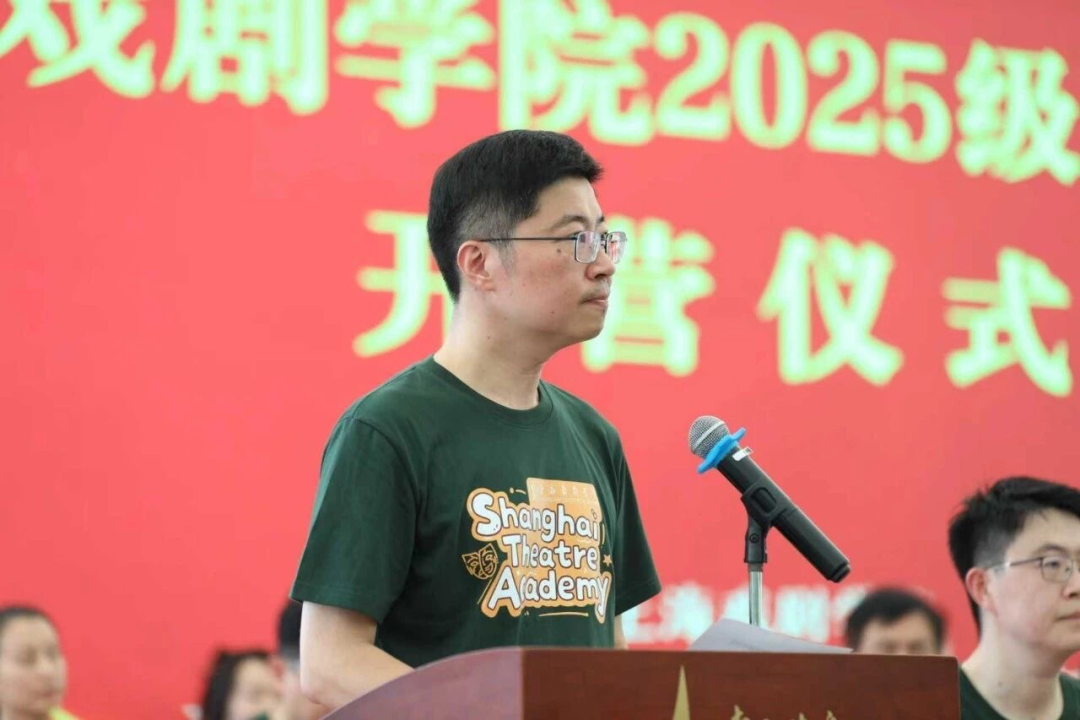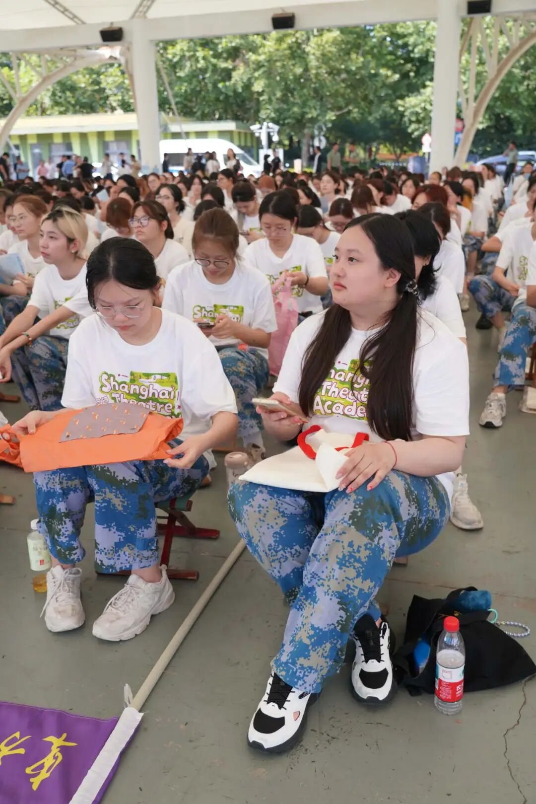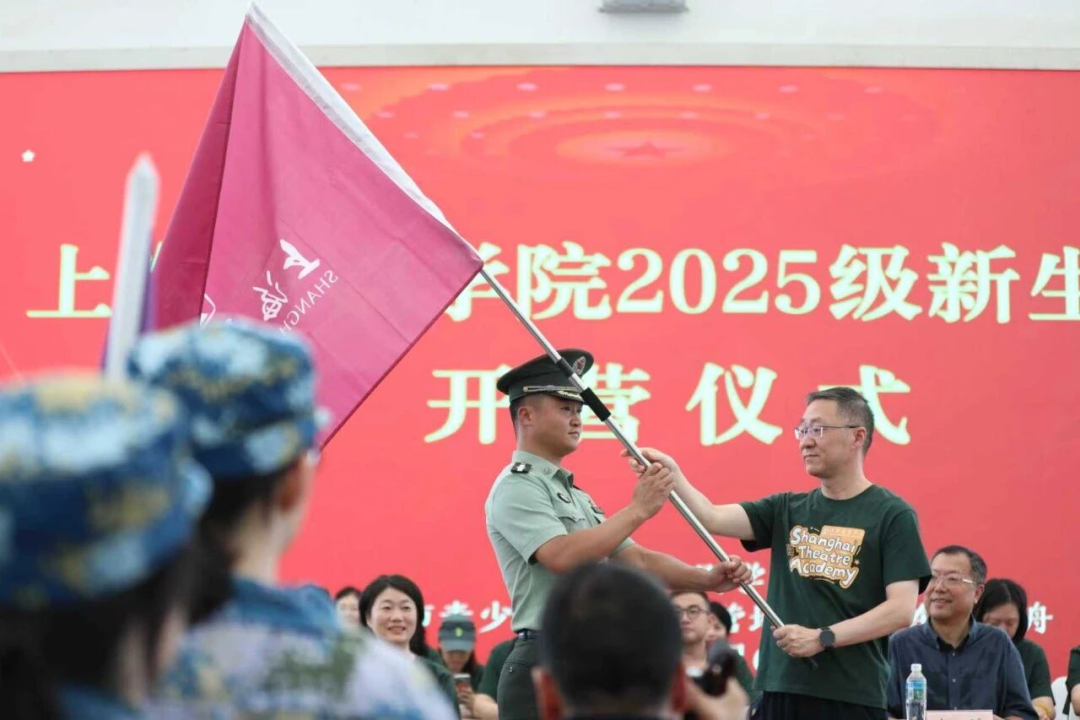 开营仪式上,上海戏剧公司党委书记谢巍向东方绿舟承训总教官授旗。新生们身着迷彩,列队整齐。国旗冉冉升起,全体行注目礼,深切敬意油然而生。