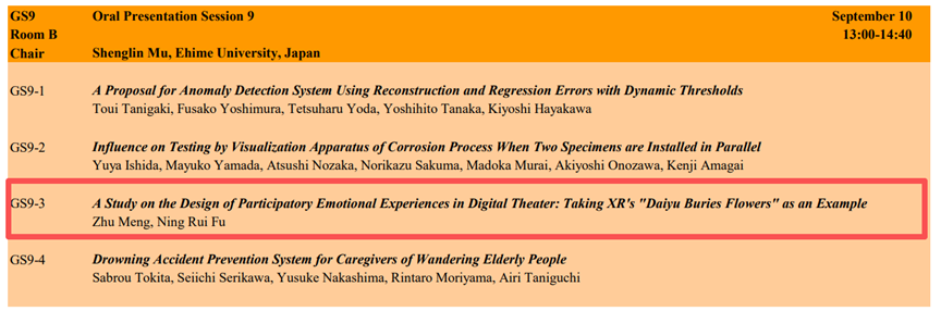 论文入选:在9月10日的口头报告环节(GS9场次),2023级、2024级数字艺术设计MFA(艺术硕士)孟竹、付蕊宁同学的论文《A Study on the Design of Participatory Emotional Experiences in Digital Theater: Taking XR’s “Daiyu Buries Flower” as an Example》(《数字戏剧中参与式情感体验设计研究——以XR作品〈黛玉葬花〉为例》)进行了分享。该论文围绕XR技术在戏剧情感体验中的创新应用展开深度分析,引发了参会学者的积极关注与热烈讨论。